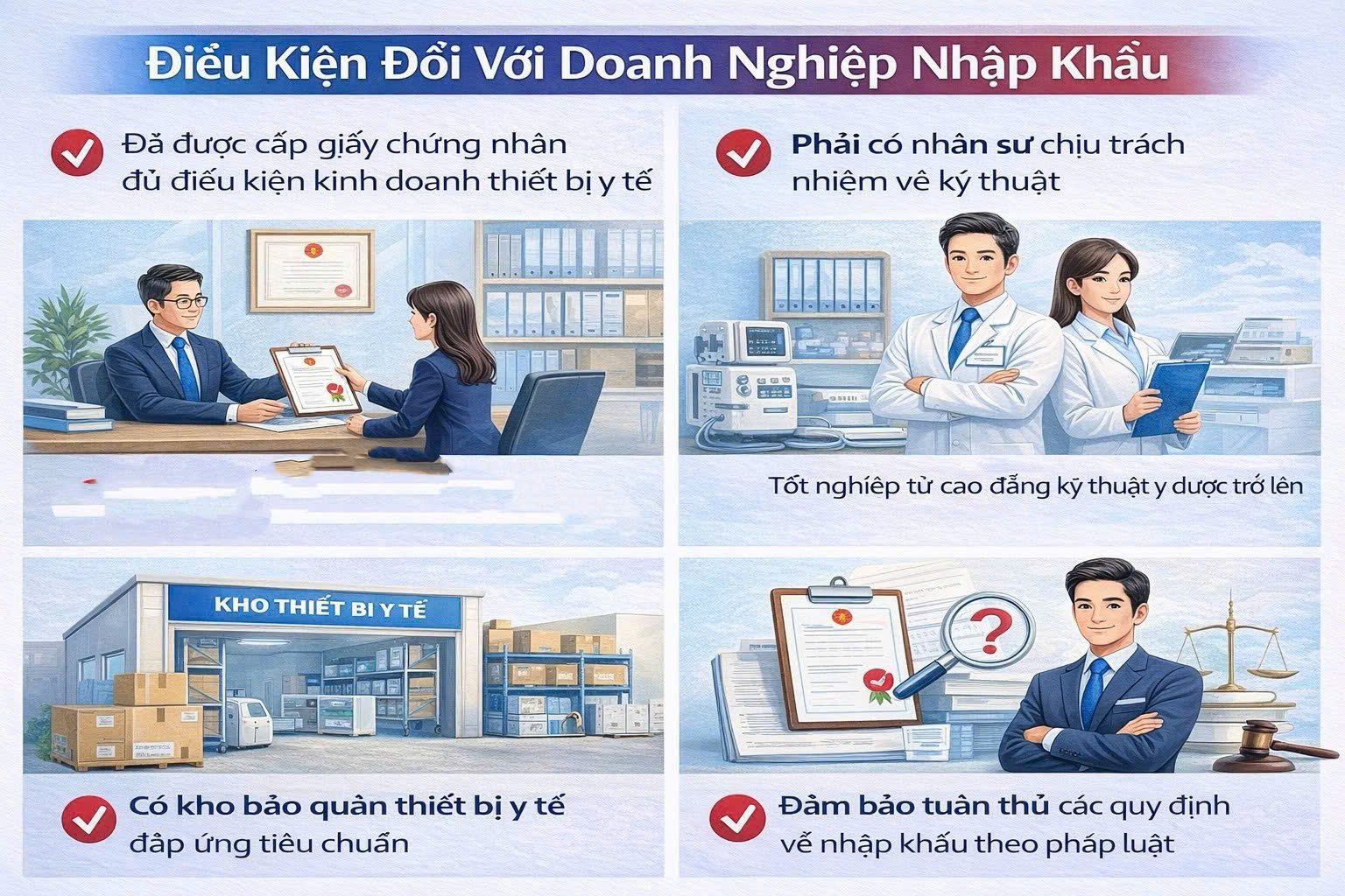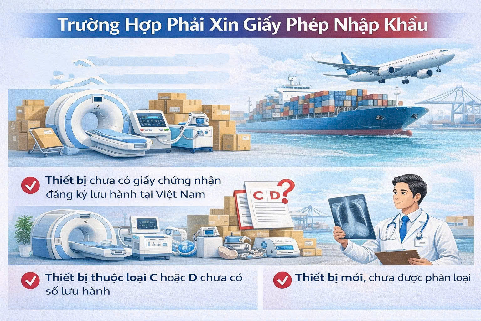 Nhập khẩu thiết bị y tế là lĩnh vực có điều kiện và yêu cầu tuân thủ đúng quy định pháp luật. Doanh nghiệp cần xác định rõ loại thiết bị, tình trạng số lưu hành, hồ sơ cần chuẩn bị và trường hợp phải xin giấy phép trước khi nhập khẩu.