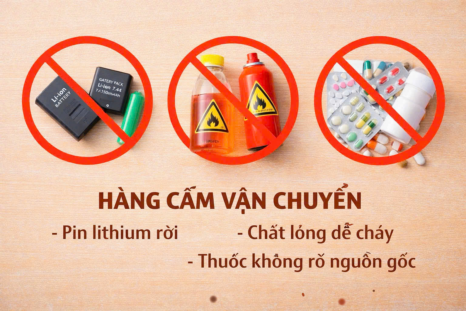 Không gửi hàng cấm: pin lithium rời, chất lỏng dễ cháy, thuốc không rõ nguồn gốc